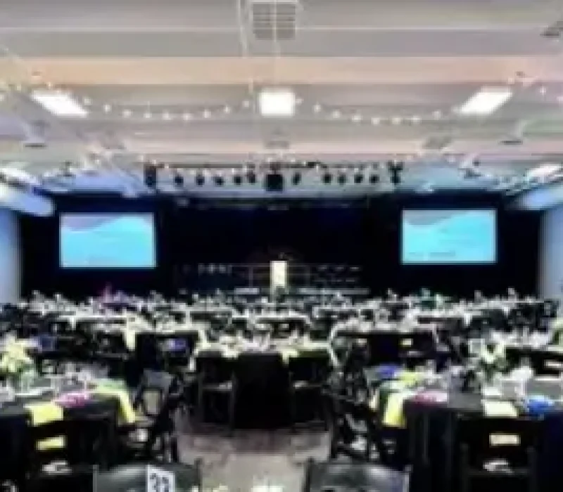 Rectangular farm tables were used for the banquet and conference sessions, providing structure and elegance. For networking areas and breakout sessions, round tables were added to encourage conversation and mingling. To complete the look, a variety of seating options were offered, including natural wood farmhouse chairs, stylish X-back chairs, and classic Chiavari chairs in black and gold. This combination allowed the client to tailor each event zone to fit both functionality and style.