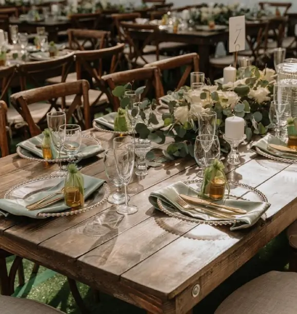 The centrepiece of any successful corporate event is the tables. For this Southern California corporate event, Rustic Yard Events provided solid wood farm tables with a charming distressed finish and authentic farmhouse appeal. These versatile pieces created a warm, welcoming atmosphere that encouraged collaboration and connection.